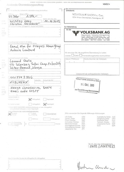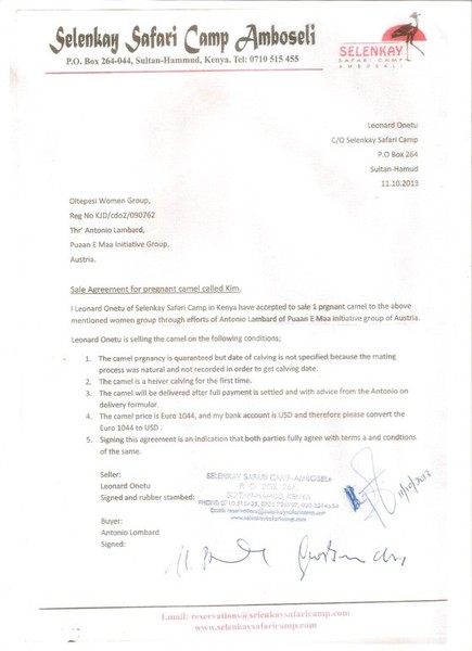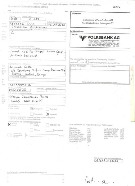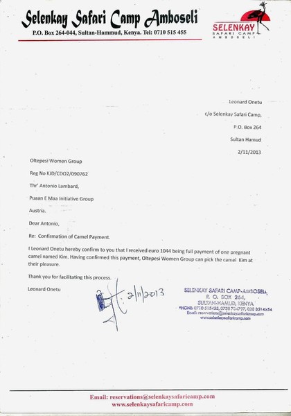 Am 10.Oktober 2013 und am 15.November 2013 wurden die Spenden für die Kamele an Leonard Onuti die Summe von je 1384 USD (1044 Euro) in Summe 2088 Euro an Leonard Onetu, Selenkay Safari Camp-Amboseli für die Kamele Kim und Kobi überwiesen.